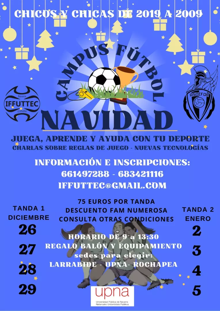 EL CAMPUS DE NAVIDAD es una actividad los días 26-27-28-29 de Diciembre y 2-3-4-5 de Enero, en horario de 9 a 13:30 horas. En el campo de fútbol. Está pensada para disfrutar y aprender de fútbol, da igual tu edad o tu nivel, pero también puedes con el Campus AYUDAR a que otros lo disfruten, y tengan una NAVIDAD alegre e ilusionante.